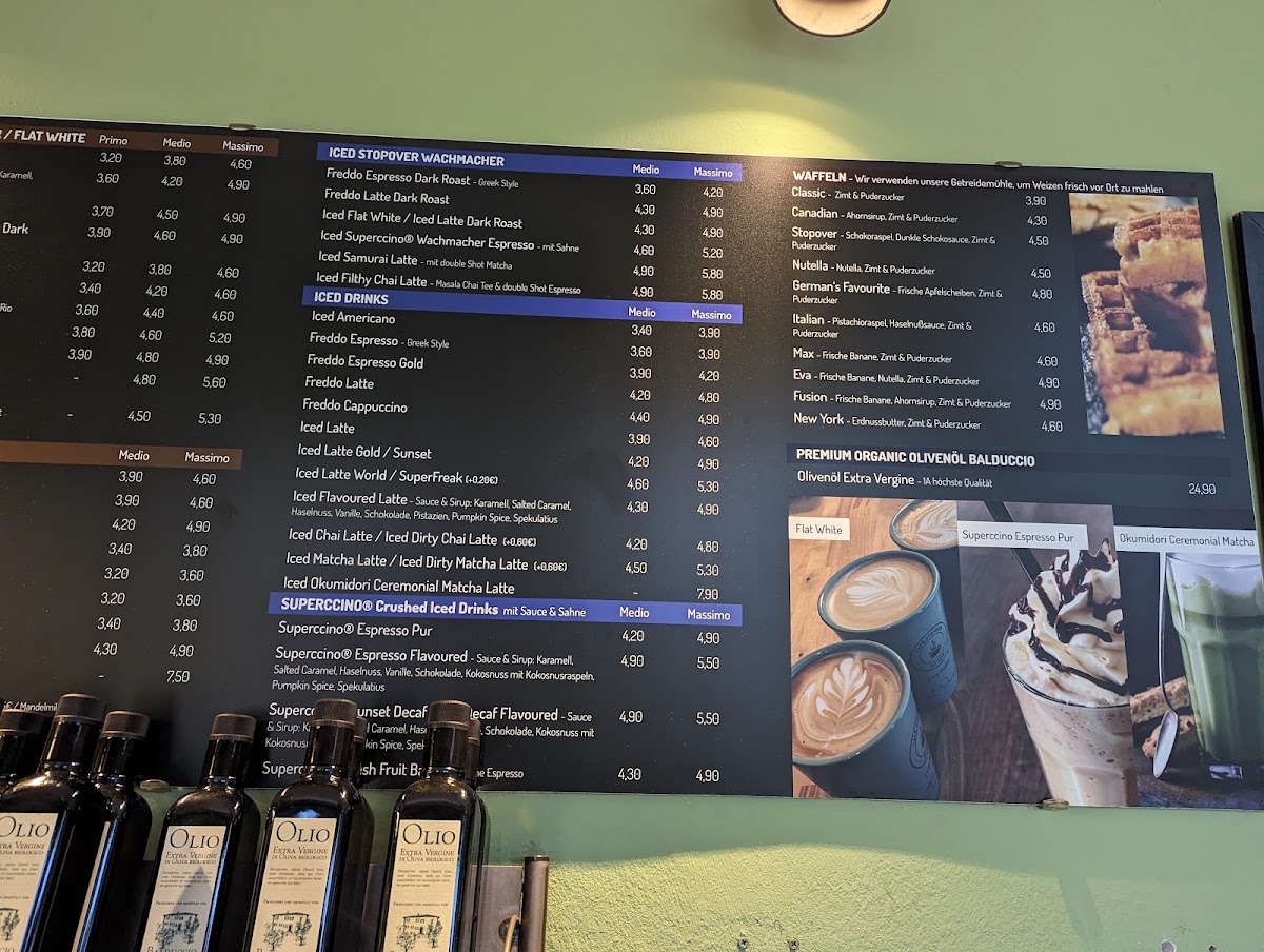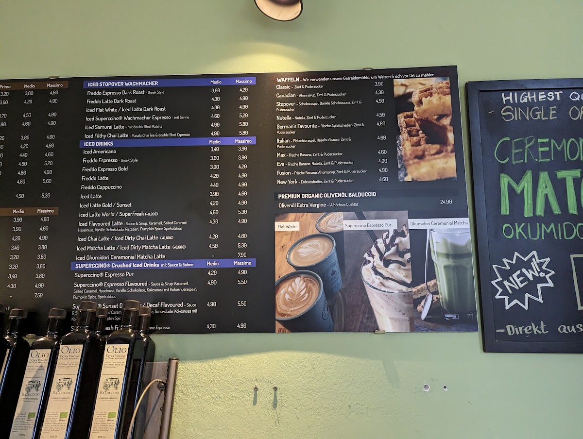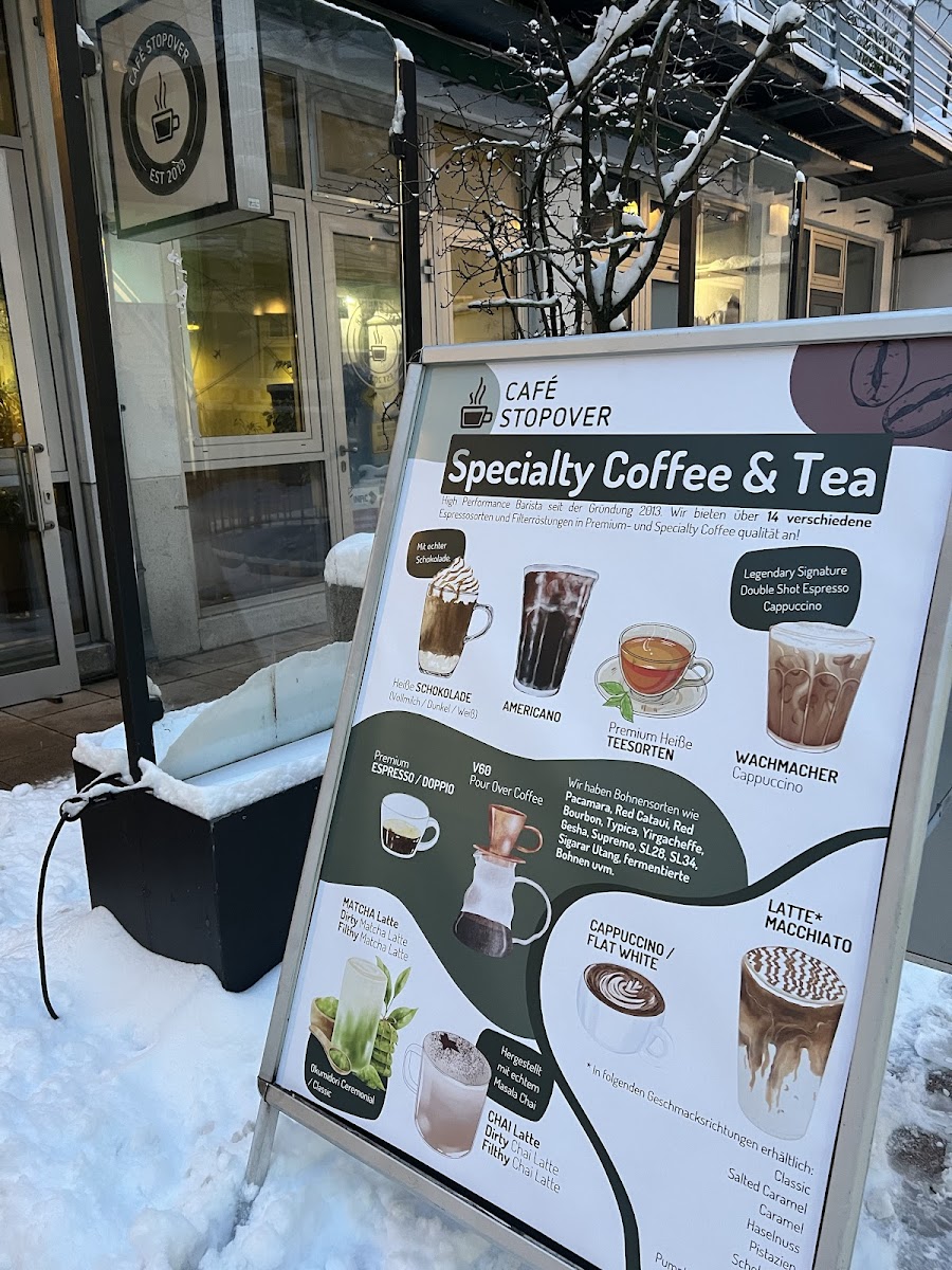 The menu at CAFE Stopover features a range of offerings typical of a café, bistro, and espresso bar. It primarily focuses on coffee and espresso-based drinks, including varieties such as cortado, chai latte, Italian cappuccino, and a specialty cappuccino gold. In addition to beverages, the menu includes light food options like Belgian waffles, including a version served with Nutella. Seasonal availability may affect specific items, such as waffles, which are not offered during the summer months.